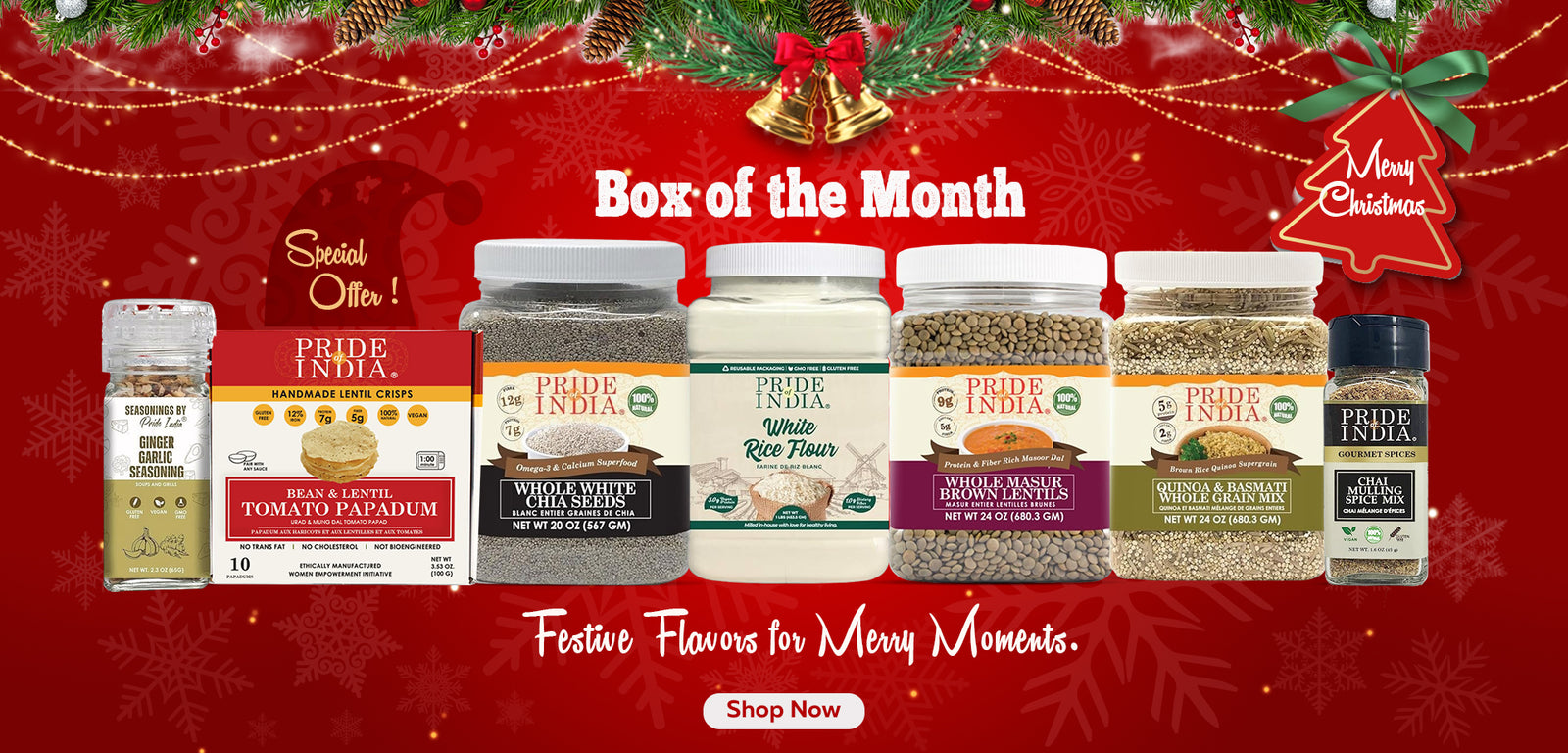 Our Christmas Special Flavor Box is designed for home cooks who crave premium quality and exciting results. This pantry box features our most aromatic spices, premium grains, seeds, guilt-free snacks all for joyful holiday cooking.