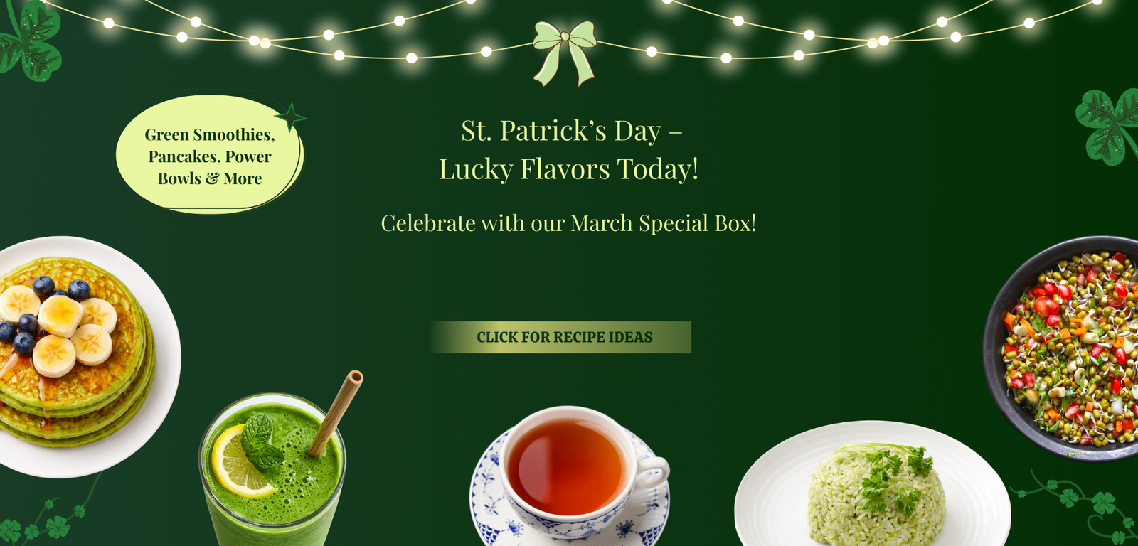 Bring the spirit of St. Patrick’s Day into your kitchen with our Box of the Month,a vibrant collection of plant-powered pantry essentials designed for festive, nourishing cooking. Celebrate the season with green-inspired recipes, and let this pantry box make it easy to create nutritious, flavorful.