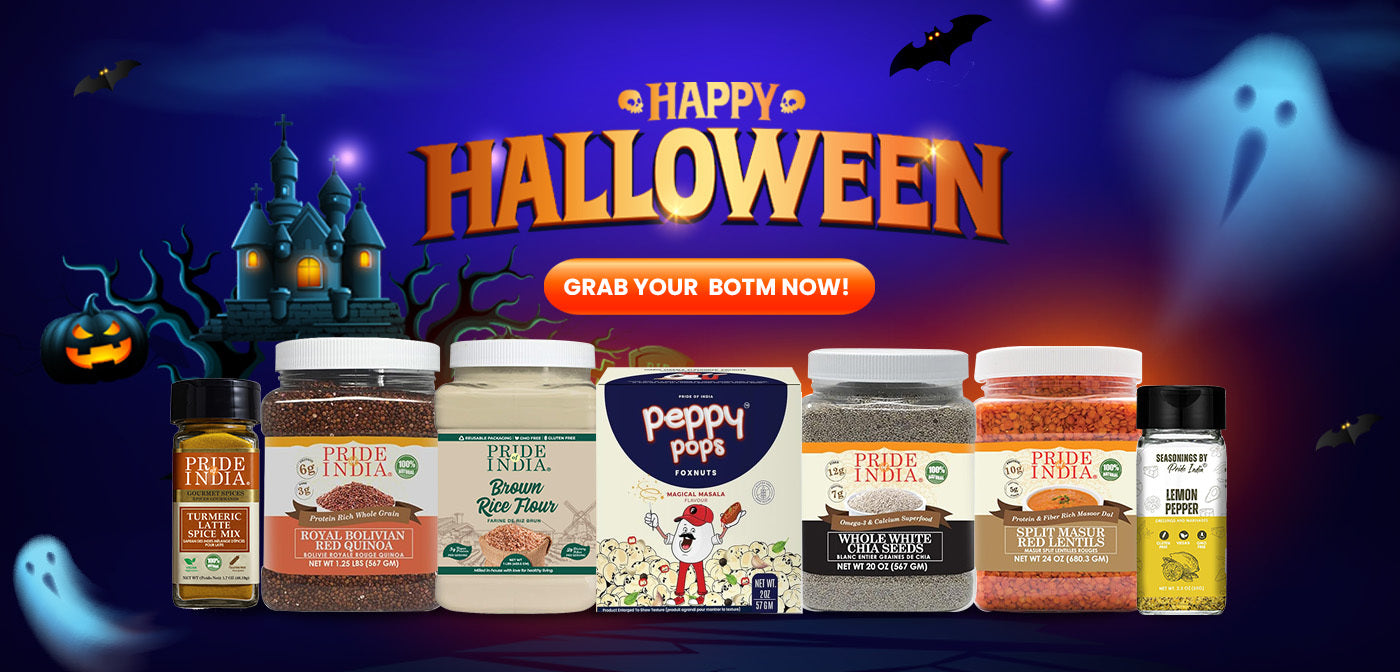 Cook up something deliciously spooky this Halloween with our flavor-packed Box of the Month! Brimming with wholesome ingredients like chia seeds, quinoa, lentils, brown rice flour, crunchy foxnuts, and festive spices, this box is your go-to for creepy bakes, spooky snacks, stuffed Jack O’ Lantern peppers, and so much more. Make every moment this Halloween deliciously memorable.